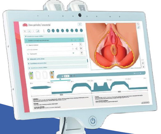 Unità carrellata con personal computer di tipo touch-screen e tastiera integrata. Il sistema è dotato di un POD (unità paziente wireless) per elettrostimolazione e biofeedback su 2 canali e può essere equipaggiato con un POD wireless per manometria, utilizzabile per biofeedback manometrico (con sonde pressorie vaginali o anali) e per esami di manometria anorettale (con catetere con 2 o 3 canali). Dispone di ampio range di protocolli prememorizzati per fisioterapia, riabilitazione perineale, estetica ed è completamente programmabile dall’utilizzatore.