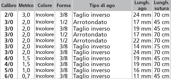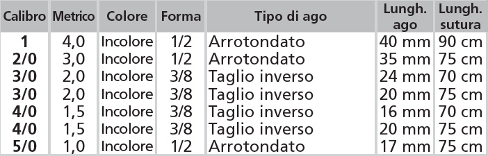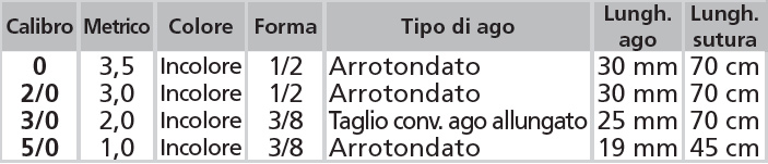 MONOGLYDE – Monofilamento poliglecaprone 25. Riparazione sotto cuticolare e approssimazione generale tessuti molli, anastomosi intestinale, chiusura peritoneo, chiusura utero e cuffia vaginale. NO per tessuto cardiovascolare o neurologico, microchirurgia, chirurgia oftalmica. No per approssimazione estesa del tessuto (fascia). Supporto ferita: 21/28gg. Assorbimento massa: 90/120gg. conf. 12 pezzi