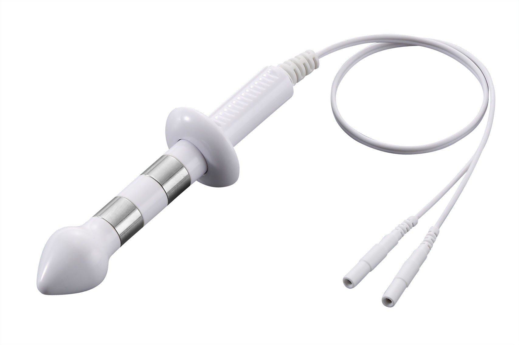 SONDA ANALE PR-013: Sonda anale a due anelli per elettrostimolazione e biofeedback EMG a profondità di inserimento regolabile. Diametro 19,6mm, lunghezza 108mm.